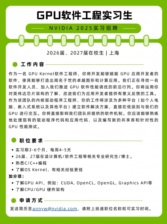 正文摘要:春暖花開的日子來了,而你們一直在蹲守的英偉達(dá)實(shí)習(xí)機(jī)會(huì),TA也來了! 我們的軟件團(tuán)隊(duì)納新中,如果你對軟件測試開發(fā)工作感興趣、有熱情,如果你也想用新一代AI開發(fā)工具創(chuàng)造和設(shè)計(jì)更好、更有創(chuàng)意的測試計(jì)劃,為NVIDIA ... |